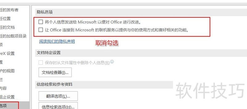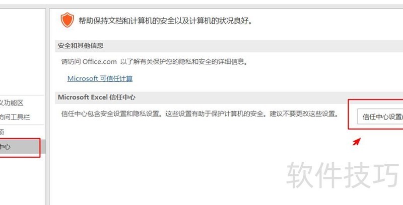 进入信任中心后点击信任中心设置,取消勾选隐私选项。