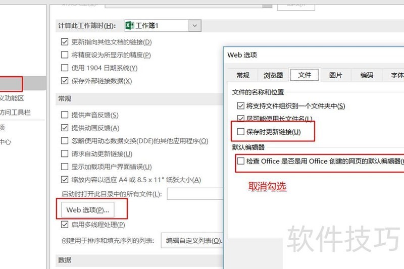 进入高级中的Web选项,在文件标签下取消勾选下方两个选项。