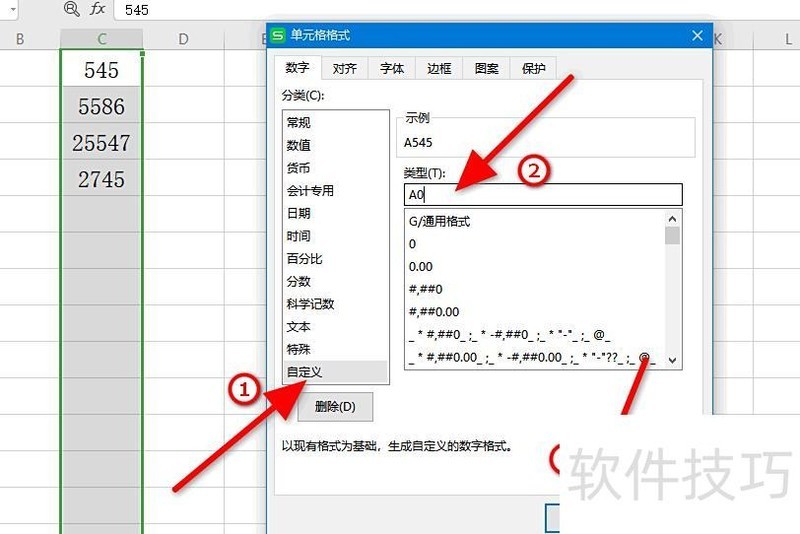 点击自定义,输入类型A0(A为指定字母),确认即可。