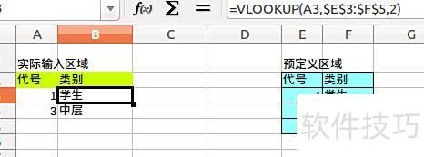 当在A3单元格输入1时,B3会自动显示学生,该结果显示源自E3至F5区域内预设的数据,所示。