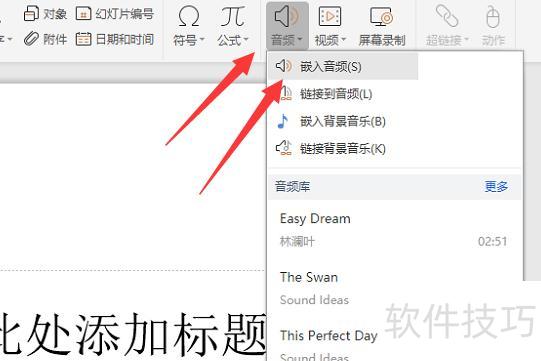可通过播放CD为演示文稿添加背景音乐,但音乐文件不会嵌入幻灯片。如需设置,可在插入菜单中指向影片和声音,然后点击播放CD乐曲进行操作。