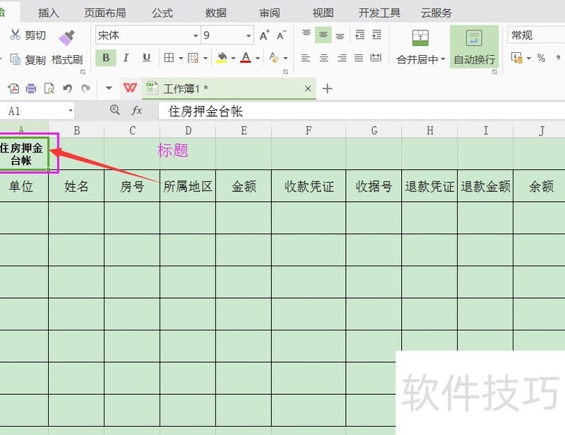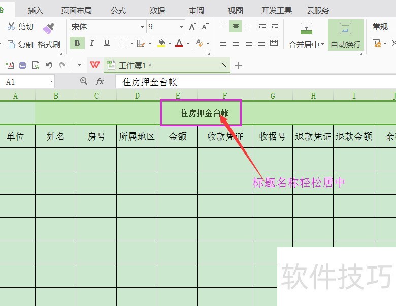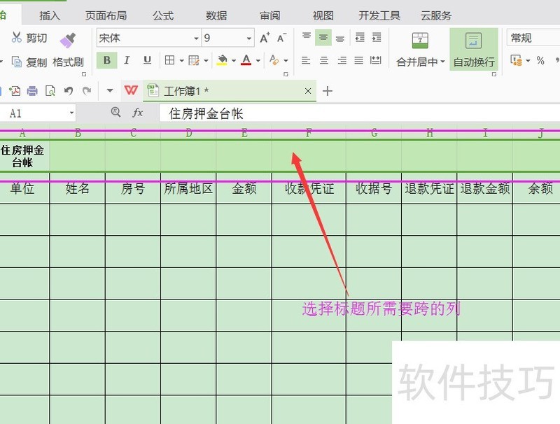 操作步骤:选中多列单元格,点击设置单元格格式,选择对齐中的跨列居中。示例:在目标行输入标题,如住房押金台账,并确保其覆盖表格的全部列(A至J列),与列宽一致。