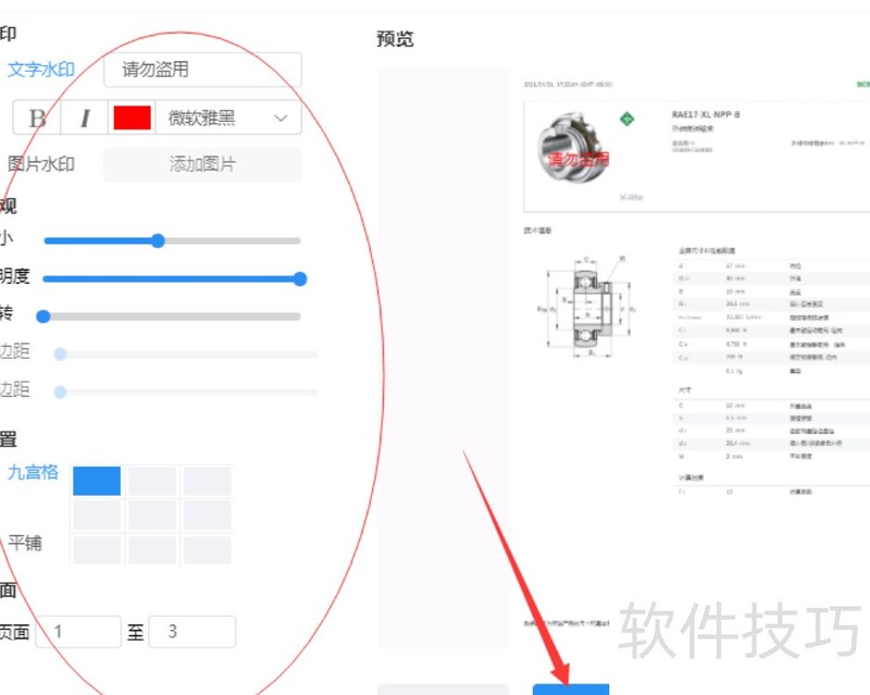 第三步,在右侧进行配置,选择水印类型,输入文字或上传Logo,并设置字体、颜色、大小、缩放比例、透明度及位置等参数。预览图将实时更新,点击可放大查看效果。