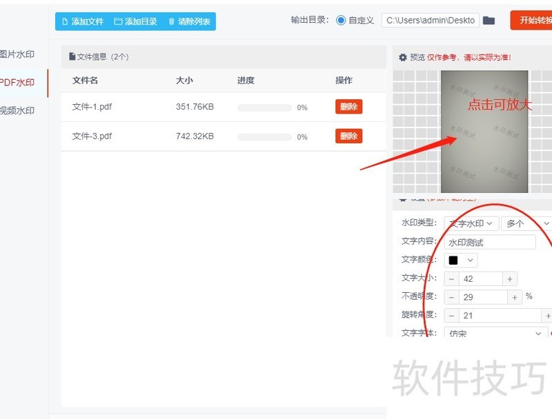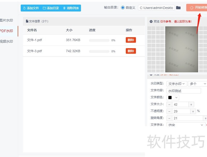 第二步,文件上传后,在文件列表中点击水印设置按钮。随后选择添加文字水印或图片水印,并根据页面提示完成相关参数配置。预览效果满意后,点击开始转换,系统随即为PDF文件添加水印。处理完成后,只需将加好水印的文件下载至本地电脑即可。