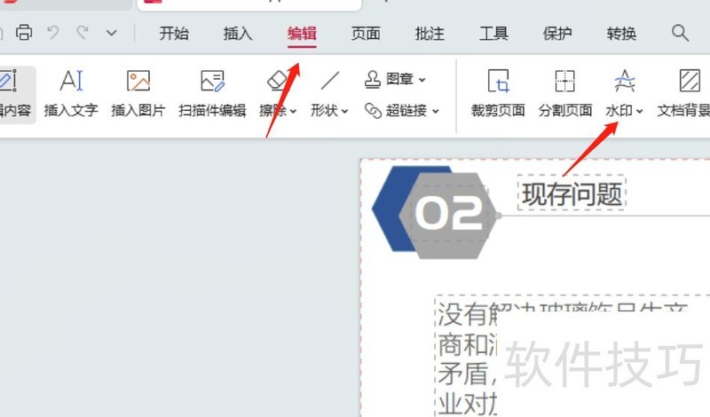 步骤1:电脑通常会安装办公软件,WPS是其中常用的一种。开机后,找到需要添加水印的PDF文件,使用WPS打开。进入文档后,在顶部菜单栏中点击编辑选项,随后在下拉菜单中选择水印功能,即可为该PDF文件添加水印,操作简单便捷,适合日常办公使用。