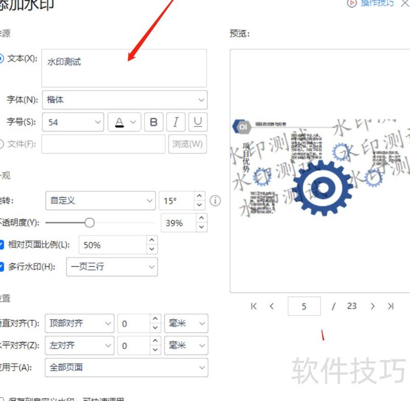 第二步,在弹出的水印设置界面中,可调整各项水印参数,右侧实时预览添加效果。设置完毕后点击确定,软件即开始为PDF文件添加水印,完成后将文件保存至电脑指定文件夹即可。