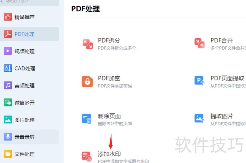 第一步,在为PDF文件添加水印前,请先在电脑上安装云朵办公软件。安装完成后打开软件,进入主界面,于左侧栏找到并点击PDF处理功能,随后在右侧的功能列表中选择PDF水印选项。