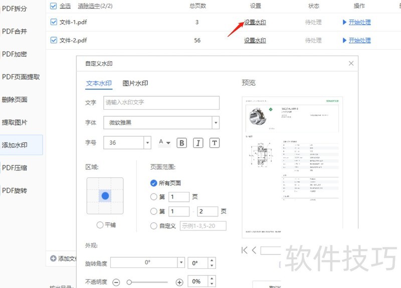 第二步,进入操作界面后,点击添加文件按钮,选择需添加水印的PDF文件并上传。文件上传完成后将在列表中显示,接着点击水印设置选项,系统将弹出设置窗口,供您进行水印配置。您可以根据需要选择添加文字水印或图片水印,并对相关参数进行调整,包括水印图像、旋转角度、透明度,以及文字内容、字体样式、颜色、大小和在页面中的位置等,确保水印效果符合实际需求。