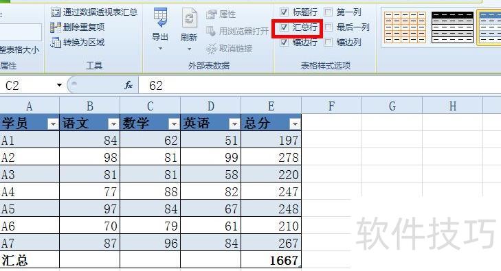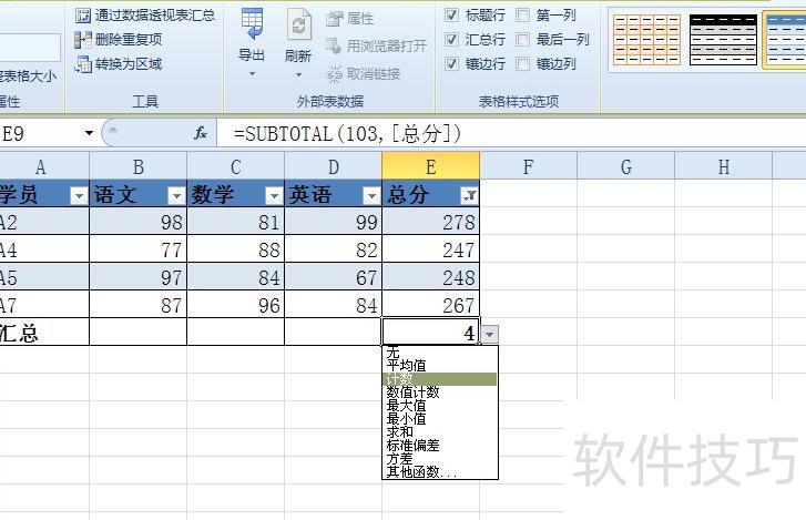 筛选汇总时,只需选择合适的汇总方式,即可统计出总分超过240分的学员人数。