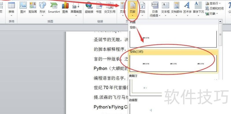 第一步:打开已分栏的Word文档,点击插入菜单,选择页脚,然后在下拉选项中选取空白(三栏),所示。