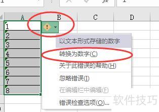 点击单元格右上角黄色感叹号,选择转换为数字即可完成操作。