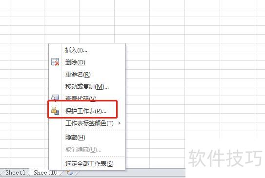 以Excel 2010为例,右键点击页面下方的工作表名称,从弹出菜单中选择保护工作表即可。