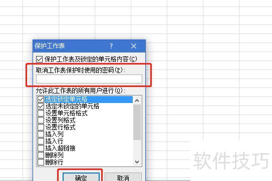 在弹出的设置窗口中输入解除工作表保护的密码,然后点击确定按钮确认操作。
