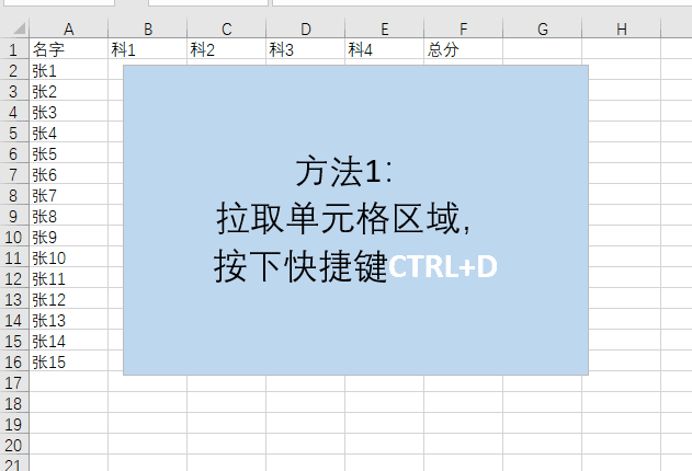 如动图所示,先选中需复制的单元格区域,再按Ctrl+D快捷键即可完成操作。
