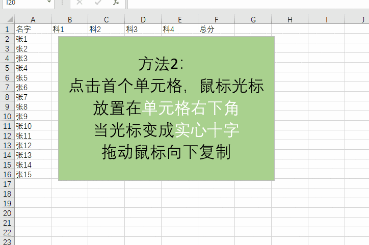 如动图所示,点击第一个单元格,将鼠标移至其右下角,待光标变为实心十字后,按住鼠标左键向下拖动至目标单元格即可。