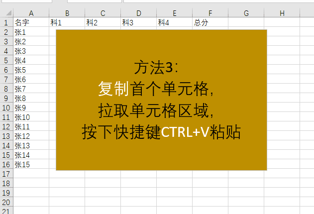 如动图所示,先选中首个单元格,按Ctrl+C复制,再拖选目标区域,最后按Ctrl+V粘贴即可完成操作。