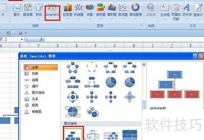 新建工作表,点击插入选择SmartArt,打开对话框后选取组织结构图,将其插入到工作表中。