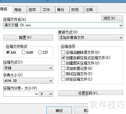 ,打开压缩文件名和参数窗口,进入常规选项卡,选中创建自解压格式压缩文件选项。