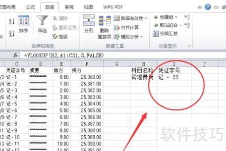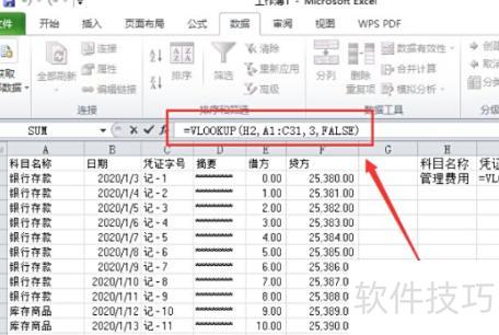 例如,要查找科目名称为管理费用对应的凭证字号,可在表格中输入公式:=VLOOKUP(H2,A1:C31,3,FALSE)。