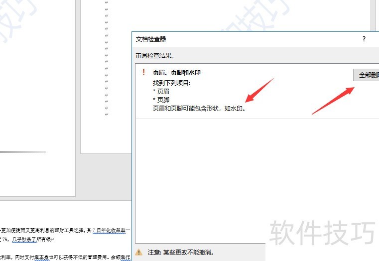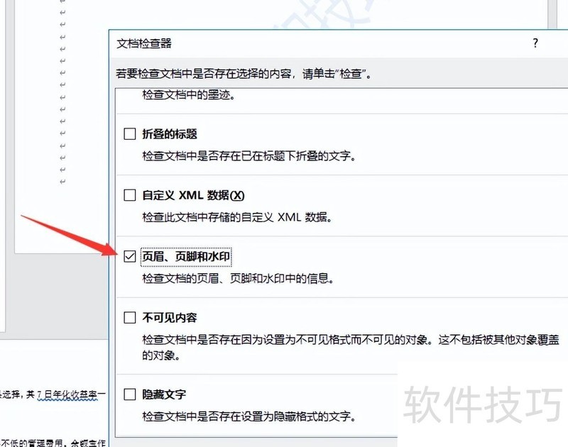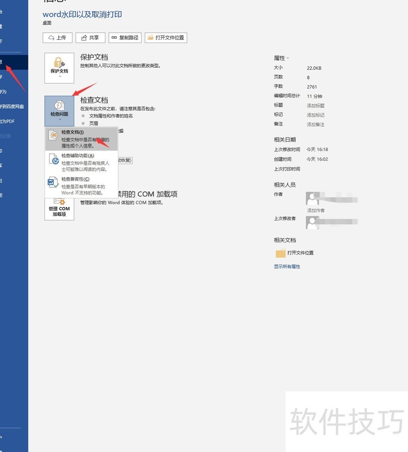 若需批量删除水印、页眉页脚,可点击Word选项中的信息→检查问题→检查文档。