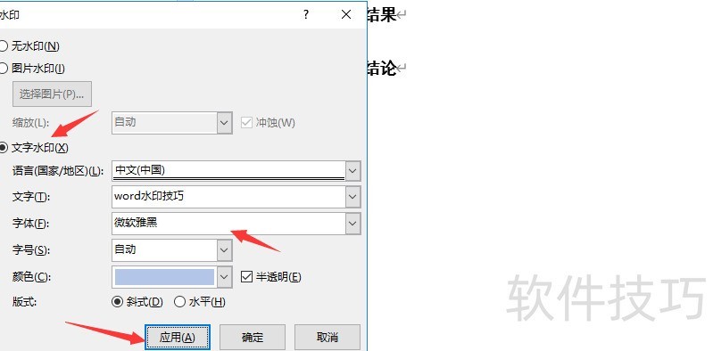 可选择文字水印,设置字体、内容及颜色等,确认后点击应用即可。