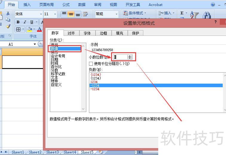 在设置单元格格式对话框中,于数字选项卡的分类列表里选择数值,根据需要设定小数位数(无小数则设为0),设置完毕后点击确定按钮即可,所示。