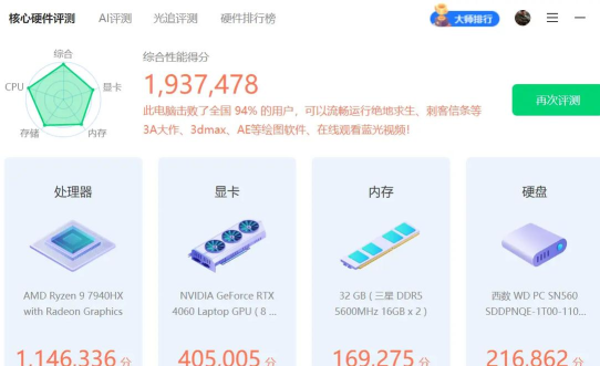 跑分完了,会出总分数,分数越高越好,但是,别只看总分,还要看子项分,比如CPU分数高,说明处理器强,如果GPU分数低,玩游戏可能卡,所以,要找出性能短板。