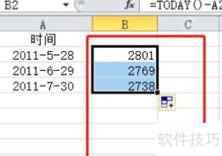 将鼠标置于B2单元格右下角,向下拖动填充公式,即可自动计算出下方各时间的相差天数。