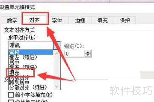 进入单元格格式设置界面后,选择上方的对齐选项卡,将水平对齐设为填充,最后点击右下角确定按钮完成设置。