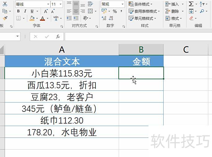 下图B列是员工手填的出差费用,格式混乱无规律,怎样才能准确提取出金额?