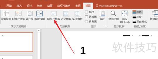 此时,页面中会显示之前输入的数字,接着点击视图选项卡中的幻灯片母版按钮,所示进行操作。