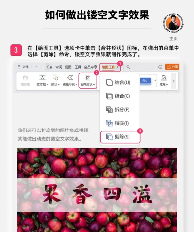 最关键的一步是实现镂空效果。此时,需同时选中文字对象和上方的白色矩形。然后点击绘图工具中的格式选项卡,找到合并形状功能,在下拉菜单中选择剪除命令。执行此操作后,文字部分会从矩形中被挖空,露出下方的图片,从而形成文字镂空、背景透出的视觉效果。