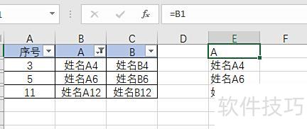 在E1输入公式=B1,然后向下拖动填充,将B列数据全部提取到E列,无论是否隐藏行都会填充。
