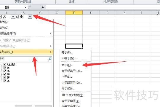 出现下拉箭头后点击按钮,选择数字筛选,并设定所需条件。
