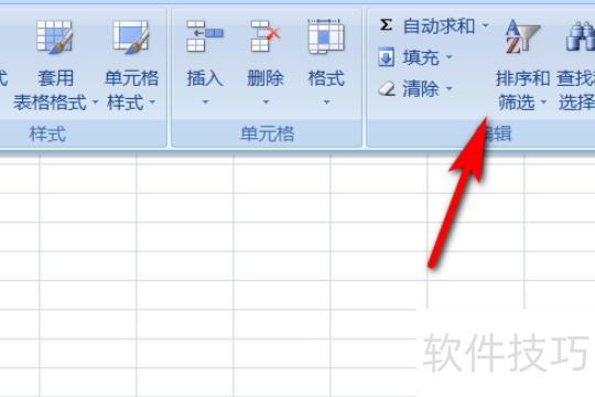 在开始工具栏中找到排序和筛选,点击其下方的倒三角图标。