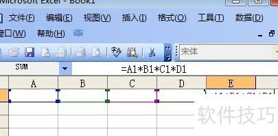 在E1单元格输入公式=A1*B1*C1*D1进行乘法运算。