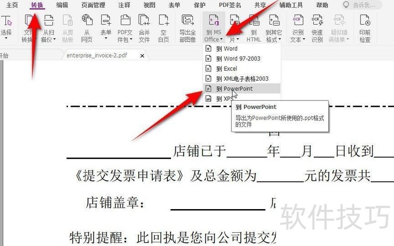 用福昕高级PDF编辑器打开目标PDF文件,点击转换菜单,选择到MS Office,再点击到PowerPoint即可完成转换。