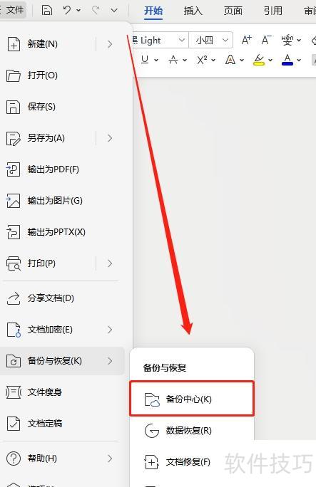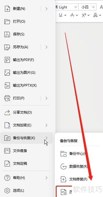 在Word左上角点击文件,选择备份与恢复,进入备份中心即可。