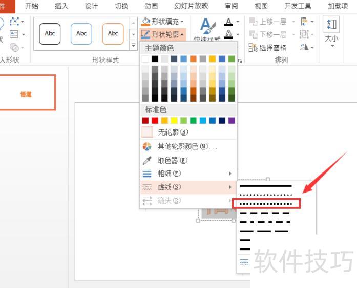 点击形状轮廓,在下拉菜单中选择虚线样式。