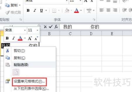 选中单元格中的部分文字,右键点击设置单元格格式,操作所示。