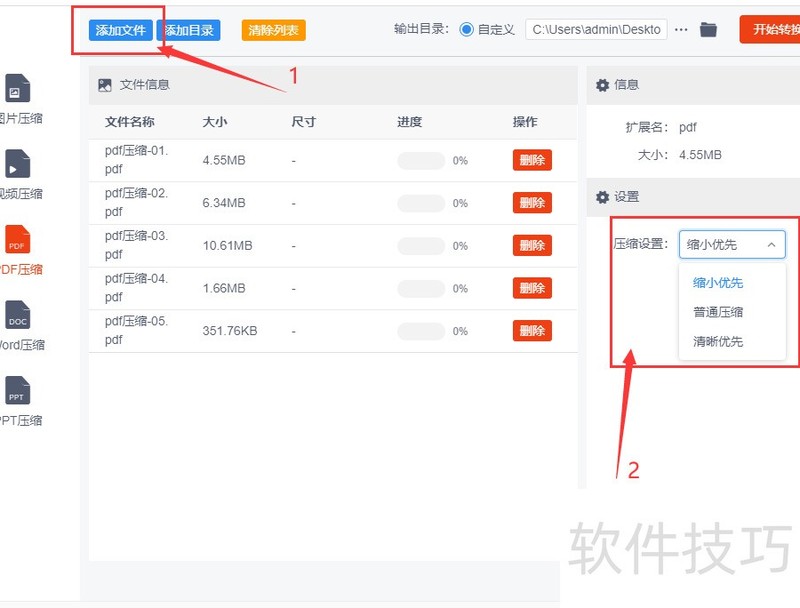 第二步,点击按钮,导入需压缩的PDF文件,支持批量操作以节省时间;随后设置压缩选项,选择合适的压缩模式。