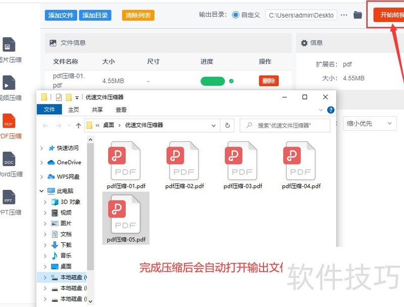 第三步,设定输出路径以保存压缩后的PDF文件;点击开始转换按钮启动程序,压缩完成后软件将自动打开目标文件夹,便于用户查看结果。