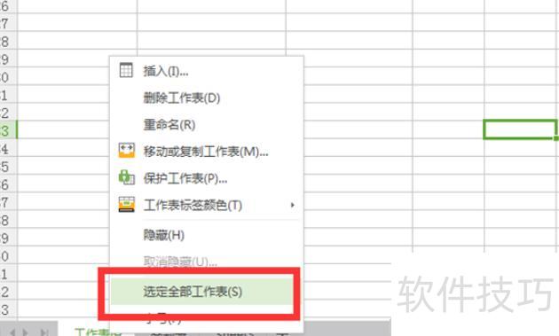 点击首个标签,右键选择选定全部工作表,此时所有工作表标签均变为白色,表示已全选。