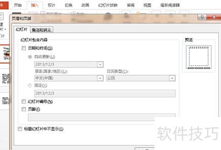 勾选不在标题幻灯片中显示复选框,点击全部应用,即可确保标题幻灯片不显示页眉和页脚。
