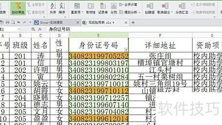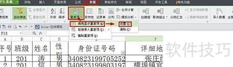 标记重复项:先临时删除含合并单元格的标题行,选择E列(身份证号码列,避免因姓名重复造成误差),点击菜单栏数据,在工具栏中选择重复项→高亮显示重复项,确认操作即可完成重复数据标记。