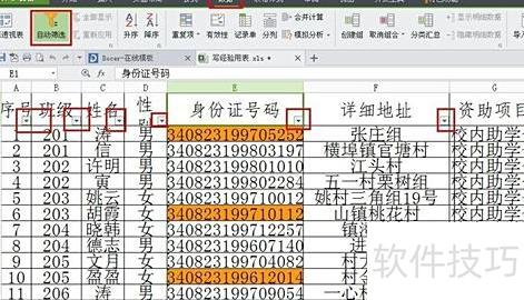 4、筛选重复项:在数据菜单中选择自动筛选,各列首行单元格将显示下拉箭头,所示。