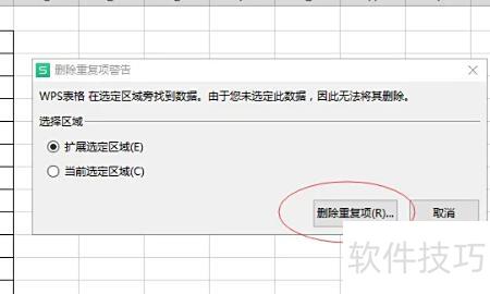 在弹出的删除重复项警告框中,选择扩展选定区域,然后点击删除重复项。