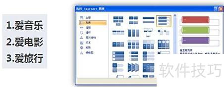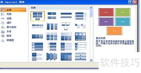 SmartArt 提供了七种逻辑关系类型,具体选用哪一种需根据实际需求判断。通常需要分析三段文字之间的逻辑关系,此处暂定为并列关系,对应图中的列表形式。在确定为列表关系后,还可进一步选择符合个人偏好的具体图表样式。