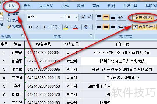 在Excel中选中目标表格,点击任务栏的开始按钮,进入开始界面后找到自动换行选项并点击启用该功能即可。