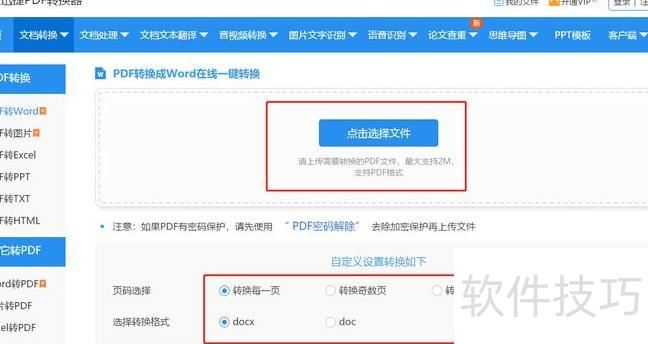 在该网站进行文件格式转换十分简便。首先选择PDF转Word功能,出现点击选择文件后暂不上传。应先在自定义设置转换中设定所需转换的页码范围和目标格式,完成设置后再添加并转换文件,确保输出符合需求。